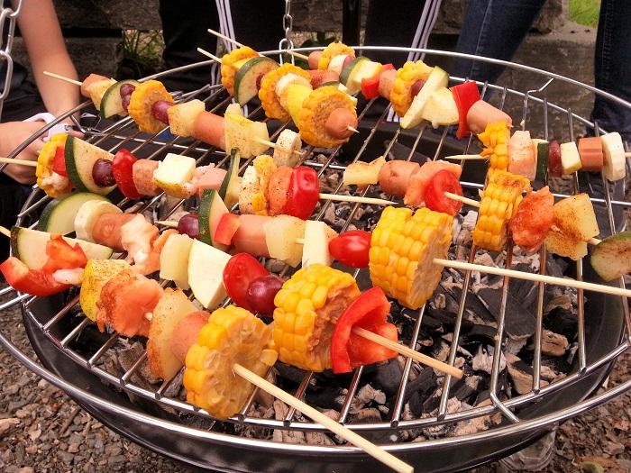 No er er det tid for grill og utekjøkken. Denne veka sette me bålpanna ut i skulegarden. Me bar med oss knivar, skjærebrett, og anna nausynt utstyr ut under open himmel. Der vart matvarene ordna til og lagt på utebuffet. Dei ferdige grillpinnane kom på grillen. Slik tok det seg ut: