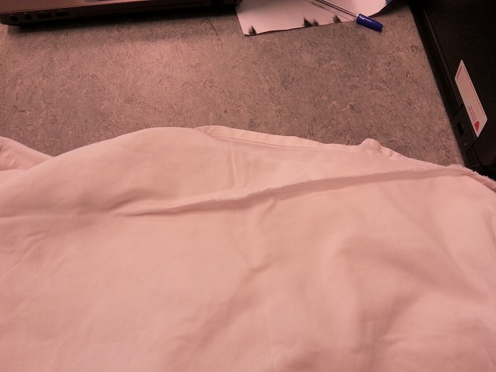 Då skulen tok til kom det ein elev med noko til skulekjøkkenet. Ho hadde reparert eit forkle! Superflott!!! No er det orden på den saken. Slik såg saumen ut frå baksida: